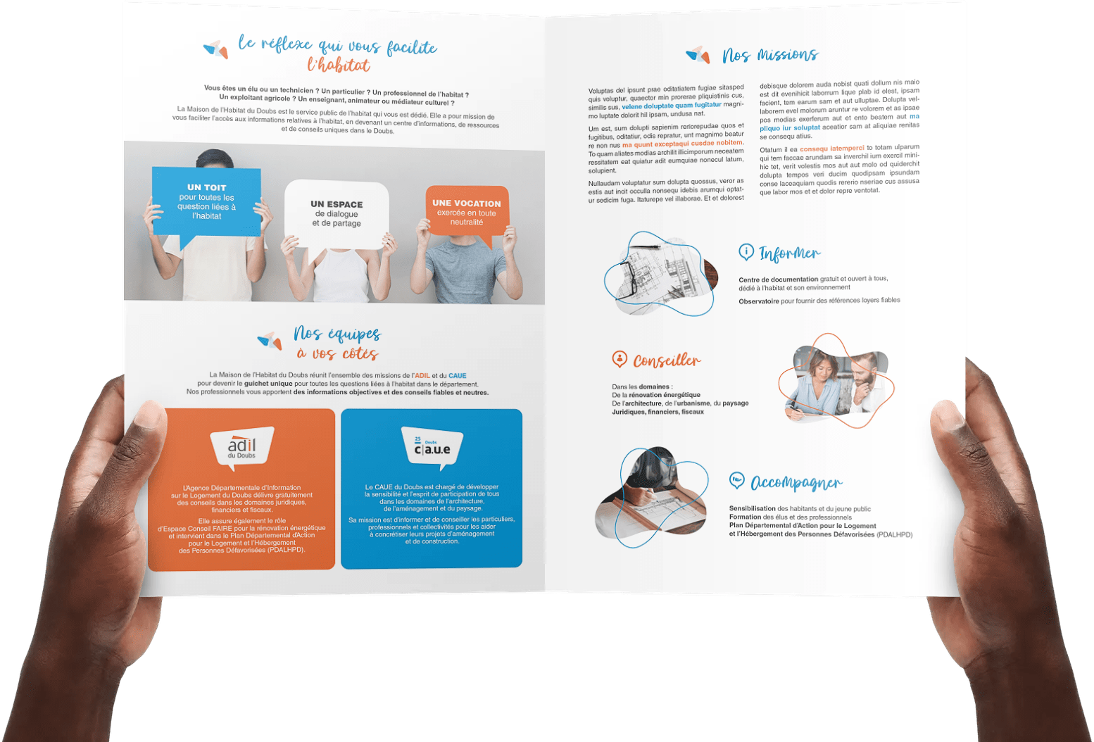 • Définir une palette chromatique fédératrice (orange de l’ADIL, bleu du CAUE).