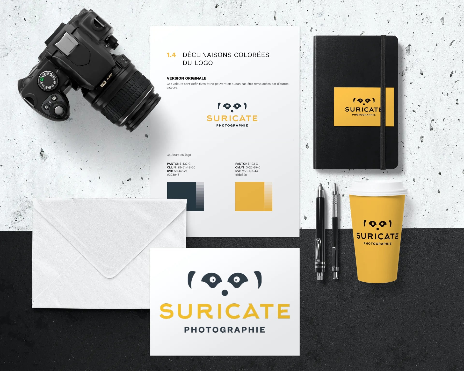 Comment construire une identité visuelle qui évite les clichés (appareils photo, objectifs, flashs), tout en affirmant une posture différenciante, moderne et durable ? Comment refléter l’essence du nom « Suricate » — vigilance, regard attentif, esprit collectif — dans un univers graphique immédiatement lisible et impactant ?